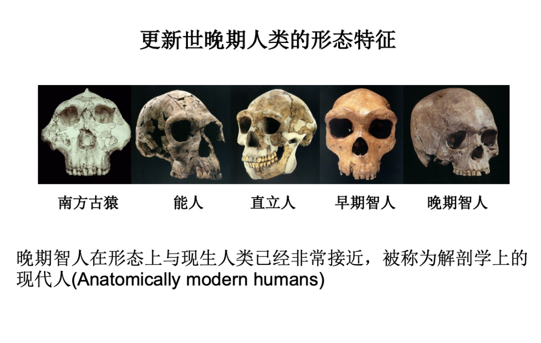 我们人类从200多万年前到300多万年前的南方古猿,再到能人,再到直立人,早期智人和晚期智人经过了几百万年的演化,那么他们从外貌特征上已经非常接近我们现在在座的每一位听众,他其实也完成了我们人类由文化到技术这样一系列的转变,我们称之为解剖学意义上的现代人,其实也就是晚期智人。