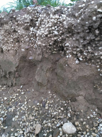 我们现在可以推断,这些应该是当时福建沿海的原始先民食用海鲜后所留下的一些生活垃圾。这些生活垃圾不断堆积,从现在我们考古发掘来看,就变成像这样密密麻麻堆积起来的贝丘遗址。