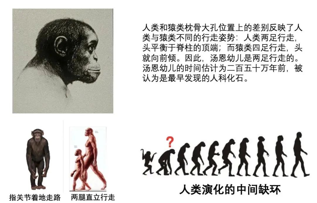 我们人类的头颅和我们的脊柱几乎是一个垂直的关系的。这个小男孩正好处在一个中间缺环的位置,正好处在一个黑猩猩和人类之间这样一个位置上。在达尔文提出进化论之后,我们一直在寻找这样一个中间的证据,介于人和猿之间的证据。这个非常不幸的小男孩正好是处在了这样一个中间缺环的位置,给我们提供了最直接的证据。我们的祖先可能是由猿到人的这样一个过程。