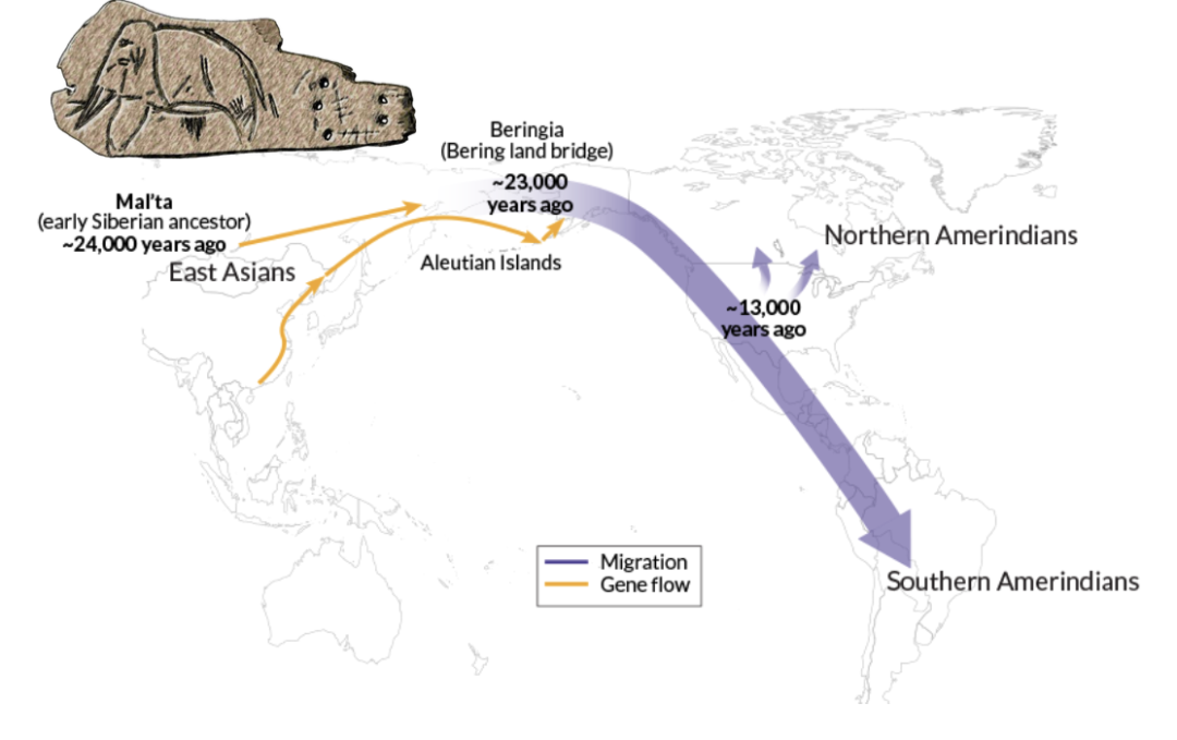 当时的美洲,我们可以想象,完全是一块新的天地。当时是什么人来到了广阔的美洲呢?我们现在通过遗传学的证据可以给出答案,他们是由两拨人群混合形成的,其中一波人是来自于西伯利亚的这些古人类,他们是在2.4万年前生活在贝加尔湖旁边,创造了马耳他文化,再加上我们的祖先两拨人群混合而成的,他们越过白令海峡到达了美洲。