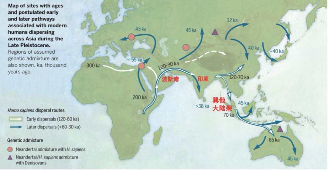 这大概是发生在5~6万年之间这样一个时间段。那么他们的路线,就是我刚才讲到的,从经过巴布曼德布海峡,然后向东扩张,穿过了阿拉伯半岛,再沿着也门-阿曼的沿岸到达了波斯湾,然后沿波斯湾到达了印度的次大陆,再到达其它大陆架,而后再经过萨胡尔,最后才到了澳大利亚。这个时间,大约是在5~6万年之间,他们到达澳大利亚南端大约是在4.5万年前。