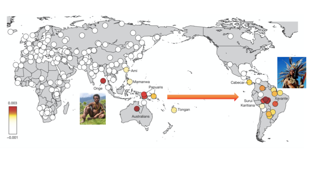 我们发现在南美洲亚马逊森林里面生活的这些美洲原住民,比如说像Surui,还有一个叫做Karitiana。他们和我们前面提到的生活在安达曼群岛上的安达曼人、生活在东南亚的像巴布亚人和新几内亚人这样一些小黑人,在遗传学上有着更紧密的关系。所以考古学家和古人类学家就提出另外一个观点——早期人类很可能还存在着一个太平洋的通道,他们漂洋过海,很可能是由东南亚到远太平洋,一直来到了南美洲,并且可能就生活在了亚马逊的这样一大块热带雨林里边。