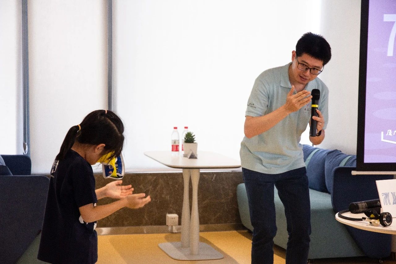VR体验结束后,讲座正式开始。杨位迪老师以“结缘海洋,走向深蓝”为主题,向各位小记者们分享了自己丰富多彩的人生经历。他首先用潜水的话题和小记者们进行互动,并与自己的女儿共同给大家演示潜水装备的使用方法,瞬间拉近了与小记者间的距离。