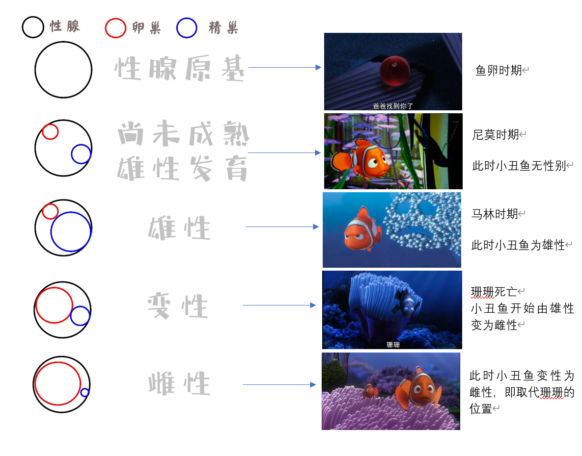 那么就让我们来探秘一下小丑鱼马林一生中可能经历的性别发育过程: