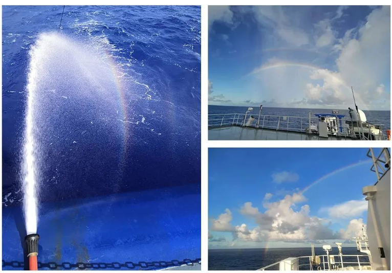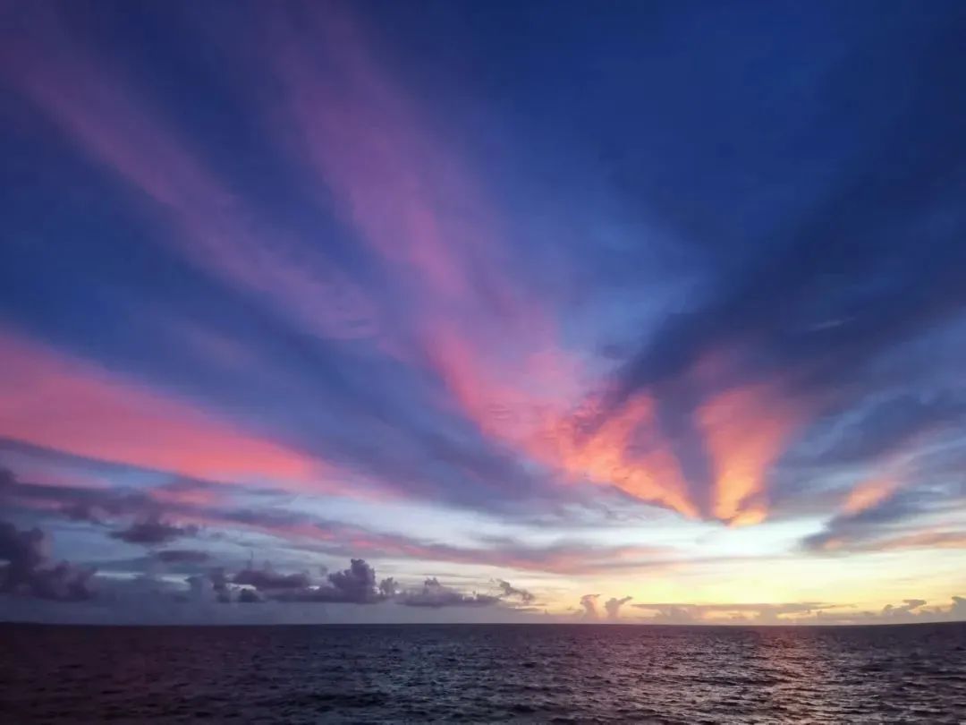 除了娱乐,海洋上壮丽的景观也可以抚平航次科考任务所有的劳累和辛苦。譬如海上的日出和日落、绚丽的彩虹、抑或水中的翩翩光影。然而大自然的美丽,不身临其境是无法深刻体会和感受,这些照片也仅仅揭开了其冰山的一角。