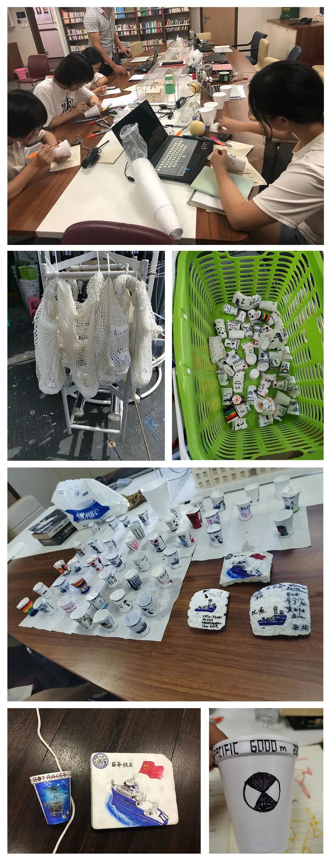 把正常大小的塑料杯画上各色图样,随着采水器下放到6000 m的深度,水压会把塑料杯均匀压缩,杯子体积会被压缩到四、五分之一。看看照片里小伙伴们正在专注地绘画,有期许爱情有恒,有祝愿家人健康,也有希望世界和平,等等。有一个手巧的小伙伴画了一幅画祝福厦门大学百年校庆,只可惜压缩后有一丢丢‘面目全非’,但是这个就是‘非战之罪’了。没有对比就没有伤害,譬如YU博士画的(最后一张),只有幼儿园小班水平(可能还没到)。