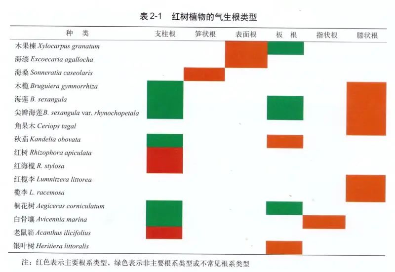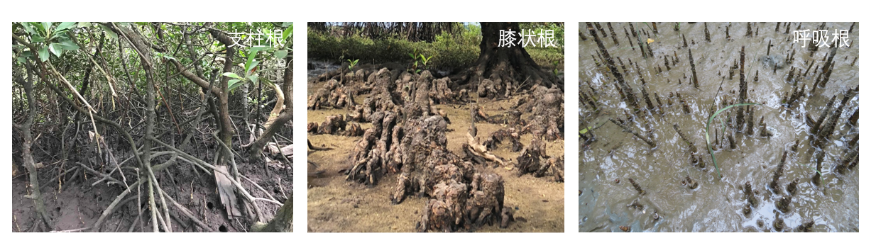 支柱根以红树植物为主,包括红海榄、正红树等等。白骨壤属(Avicennia)和海桑属(Sonneratia)的种类中,背地性生长气生假根能有效地在大气和红树植物根系内部进行气体交换。膝状根主要以木榄属为代表。远看像一尊尊小菩萨,非常可爱。板状根中,比较有代表性的是秋茄和银叶树。木果楝的根系为表面根。