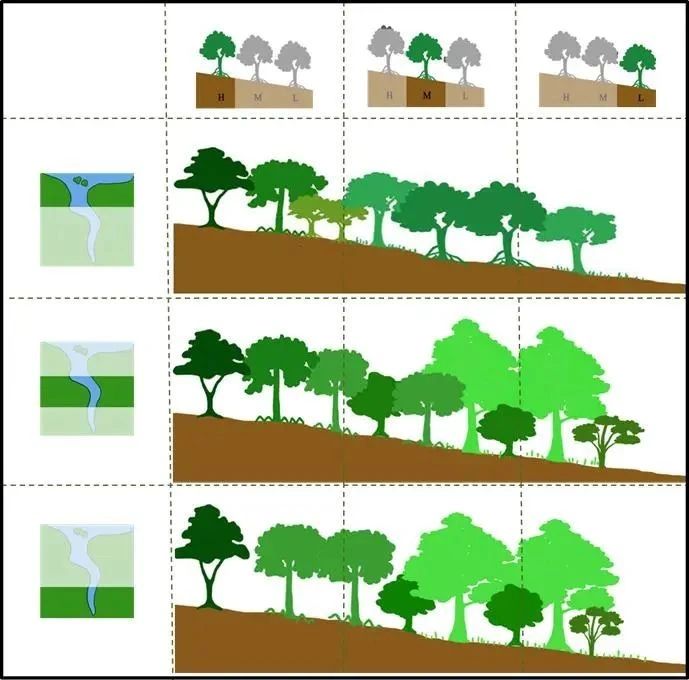根据每个物种的特性,他们在潮间带分布的位置也不尽相同。耐淹水和对盐度的耐受性都会影响其在河口区以及潮间带的分布。