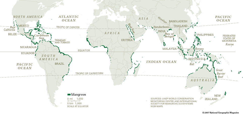 红树林大致分布在南、北回归线之间;但由于温暖洋流的影响,有时红树林也可分布到北纬32°和南纬44°。全球红树林的总面积约为138,000平方公里,仅占全球陆地面积的0.1% (Giri et al. 2010)。我们福建到福鼎是红树植物在我国自然分布的北缘,全球红树林的总面积约为138,000平方公里,仅占全球陆地面积的0.1% (Giri et al. 2010)。