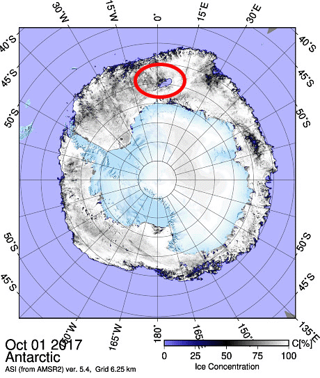 2017年10月至11月南极海冰变化图,红色圈出部分为离岸冰间湖