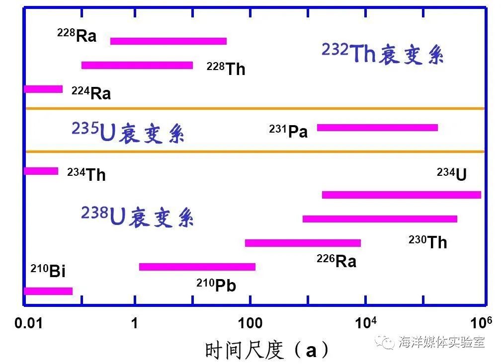 首先,我们需要知道不同深度的沉积物的年龄。其中的“天然放射性核素”是最好用的海洋沉积物测年手段之一。人们可以用它们测定不同的沉积层、化学沉积物以及沉积物柱中残存的生物体的年龄,从而判断沉积物柱不同片段所处的年代。任何放射性核素,只要半衰期适宜,理论上均可用于测定沉积物柱的年龄。我们需要做的,就是选取合适的尺子去更好地衡量。