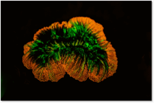 同时我们在夜景中拍摄很多珊瑚荧光。除了那些共生有虫黄藻的珊瑚,我们发现其他生活在较深水层的珊瑚也具有荧光,但它们为什么需要荧光呢?是否也是因为需要光保护呢?非常需要深入研究,通过摄影我们也有了更多新的认识。