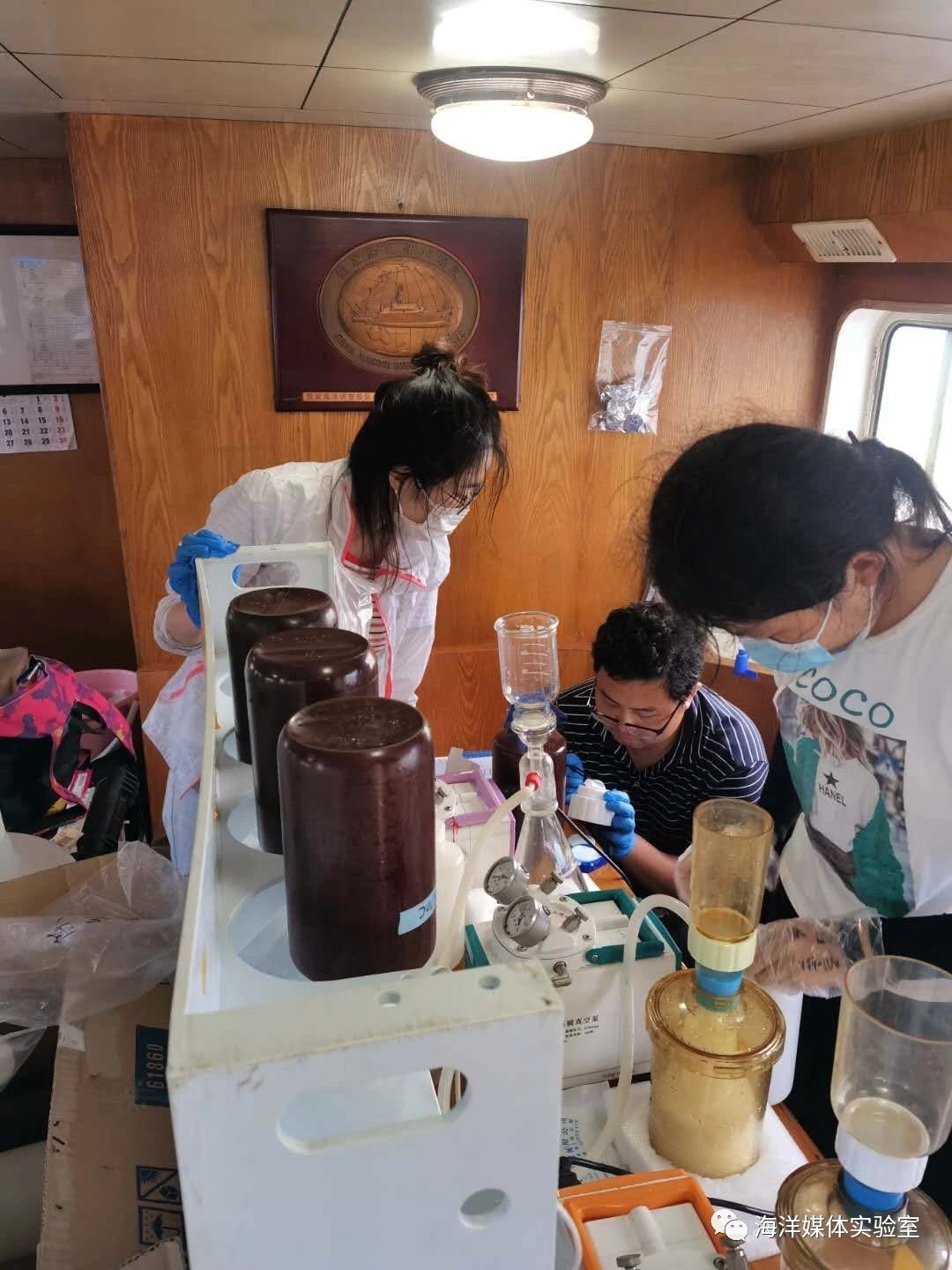 个别队员晕船严重,恶心呕吐,但并没有退缩,在自己的工作台附近放上一个垃圾桶,随时防备。在稍稍缓和之后,又重新投入到与样品的战斗中。