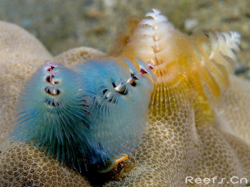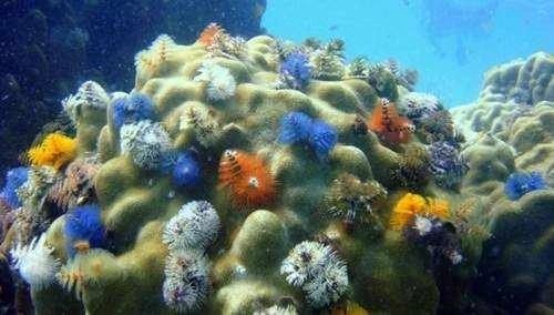 人们也常常把团块滨珊瑚这类块状珊瑚又称作长着圣诞树的珊瑚,原因是一些色彩缤纷,酷似圣诞树的大旋鳃虫时常嵌入块状珊瑚表面,在这安家。他们的入住不仅能够为色彩单调的团块珊瑚点缀色彩,也能够分泌一种化学物质以保护珊瑚不受其他生物的侵害。