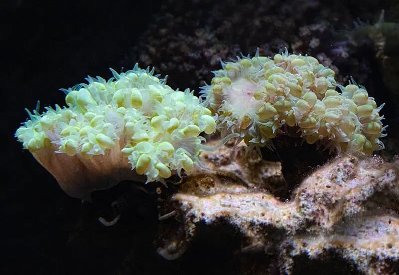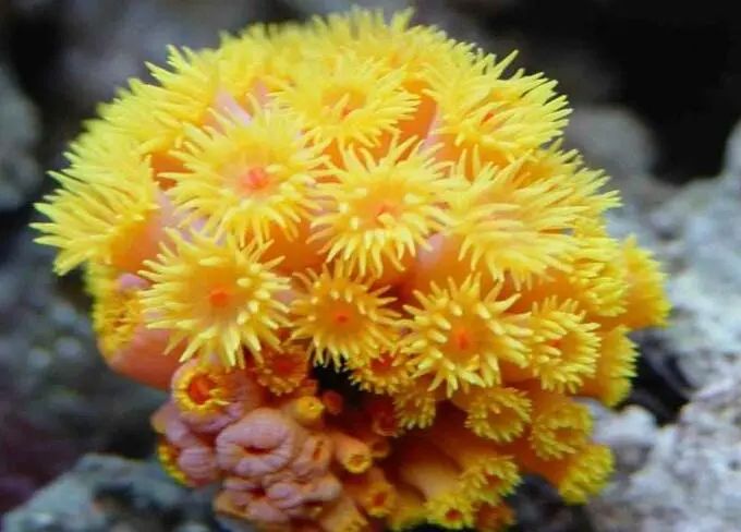 它喜欢在阴暗处活动,而且只在阴暗处伸展它那金黄色的触手,绽放一朵朵金黄色的“太阳花”。它没有共生虫黄藻,因此总是十分“饥渴”,需要不停的喂食,是一个妥妥的肉食动物。