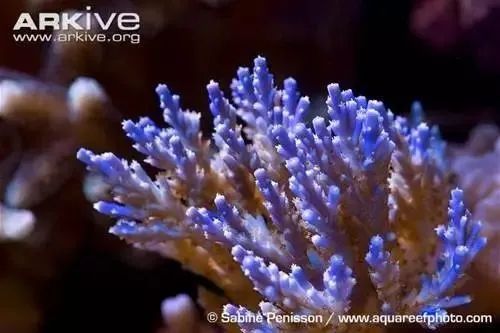 细枝鹿角珊瑚,为分枝形珊瑚的一种,分枝通常以奶黄色或棕色为主,分枝末端是非常特别的亮蓝色或者紫色,从珊瑚骨架图来看,其分枝多而细长,“大长腿”的称号并不为过。然而,拥有“大长腿”有时也并非好事,在风海浪来临时,细枝珊瑚往往首当其冲,最容易被大片折断。