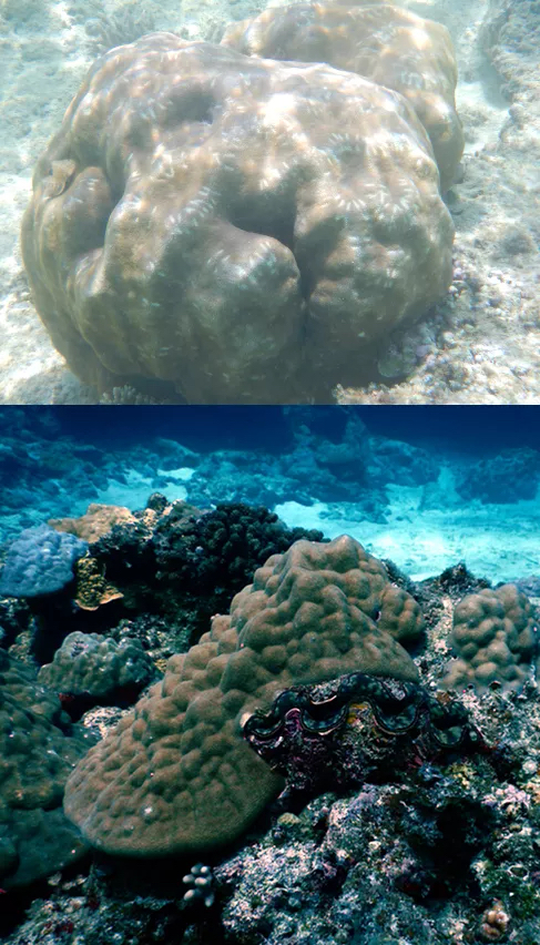 大家可能很难相信,上图的两种形状相去甚远的珊瑚竟然都是同一类珊瑚——澄黄滨珊瑚,图片上方近球型的珊瑚生长在浅浅的、约3m深礁池里,而在15m深左右的地方,呈现出了图片下方这样的形状,下部伸展出来,类似古寺里的铜钟。可见,环境对珊瑚形状的形成影响之大。