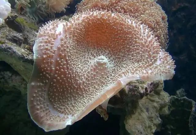 象耳香菇珊瑚 ,表面呈波浪形,有很多口,是不是很像我们平时涮火锅会吃的毛肚呢。而当它觅食或者遇到惊吓时,周围的边缘便会向中间慢慢收拢,形成一个圆球状,将猎捕到的食物包裹在里面食用,很是可爱。