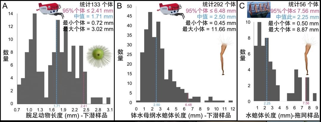 “就当是一场梦。”但这样欣欣向荣的现象,对于大部分的生物来讲其实可能只是一场梦。前面提到,这里主要是依靠表层较少初级生产力的沉降来供给营养,没有充足的营养来源,生物便无法完成正常发育。所以这个群落中的个体都是毫米级的。