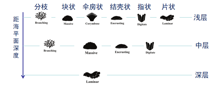 而在中深层中,结壳、片状和块状珊瑚更适合在这样的极端光学条件下生存和繁衍,它们是稳重的慢性子,使得自身对于环境压力更为耐受。在微光环境中的珊瑚将在群体形态水平上最大化自身表面积,从而提高对于光线的接收能力,维持着生存与生长。