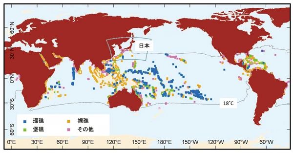 · 世界上现存的珊瑚礁主要分布在南北纬30°之间,不成礁的石珊瑚群落分布的北缘可达南北纬35°,也就是热带与部分温带海域