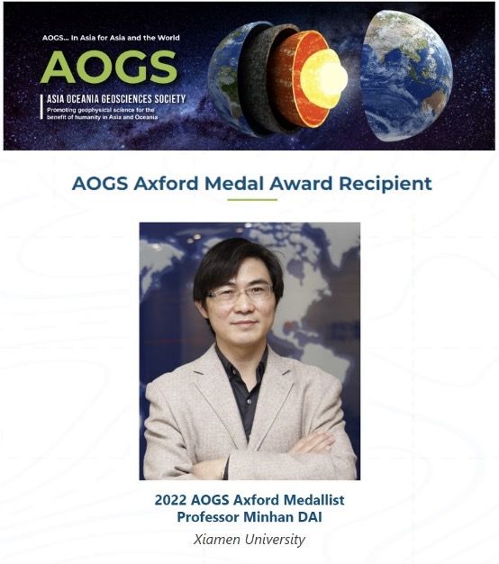 2022年6月15日,亚洲-大洋洲地球科学学会(Asia Oceania Geosciences Society, AOGS)公布了“艾克斯福特奖”(Axford Medal)2022年度获奖人选,厦门大学近海海洋环境科学国家重点实验室戴民汉教授荣获该奖项。
