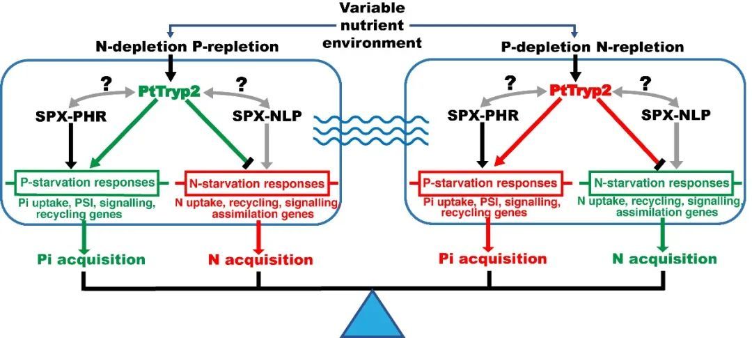 为进一步揭示海洋浮游植物胰蛋白酶的功能,研究团队以三角褐指藻(Phaeodactylum tricornutum)为模式生物,通过综合运用CRISPR/Cas9基因编辑、转基因、过表达及亚细胞定位、RNA-seq、生理参数测定等分子生物学和细胞生物学理论和方法,探究了胰蛋白酶PtTryp2 在三角褐指藻中的亚细胞定位和PtTryp2基因被敲除或过表达后藻细胞在不同营养盐条件下的生理响应、基因表达谱及重要代谢途径变化。研究结果表明,PtTryp2通过两个层级实现其对N、P营养吸收的双向耦联调控。首先,PtTryp2抑制N吸收的同时促进P吸收。其次,细胞通过调整PtTryp2的表达水平来实现对N、P营养变化的协同响应:当环境N营养匮乏时,细胞内PtTryp2表达下调,造成N营养吸收加强,P吸收减弱,从而使得细胞内N:P比例相对稳定;当环境P营养匮乏时,细胞内PtTryp2表达上调,P吸收加强,N吸收减弱,相对稳定的细胞内N:P比例得以维持。这表明,PtTryp2可通过调节自身的基因表达水平来应对营养盐变化,即通过新陈代谢调节,减小N-P平衡这个“跷跷板”的振幅,以达到促进不同营养盐的协同利用并维持胞内营养盐化学计量比稳态(图2)。该成果为深入研究浮游植物对营养环境变动的响应与适应机制指明了新方向,为构建可预测未来增温引起的大洋寡营养化与人类排放引起的近海富营养化如何影响浮游植物群落结构与功能的生态模型提供了理论基础。