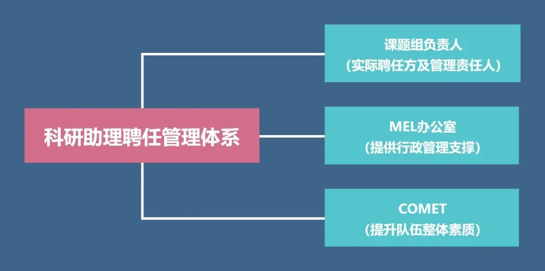 目前,科研助理聘任已经形成较为完善的管理体系,由课题组负责人、MEL办公室及COMET三方协同构建。课题组负责人作为科研助理的实际聘任方及管理责任人;MEL办公室为科研人员提供行政管理支撑,为科研助理岗位具体聘任提供服务,同时规范化聘任程序;COMET则在课题组实验室安全、仪器设备管理等方面将科研助理岗位纳入统一管理及培训,为科研助理岗位提供技术管理支持,保障课题组科研工作的规范有序,使这支队伍的整体素质不断提升。三方协同管理,使得科研助理制度有所依、能力提升有支持、职业发展有引导。