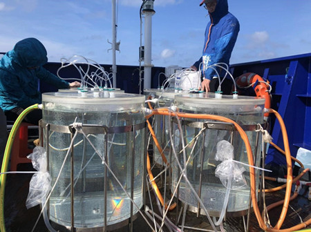 据航次首席科学家,我实验室副教授柳欣介绍,本航次共完成17个站位作业,CTD剖面作业133次,浮游动物多层网拖网80次,海底地质柱状采样10次,遥感光学作业25次,并开展了5次中尺度酸化围隔培养实验,超额完成即定任务。其中在南海海盆至珠江口断面完成4个时间连续站和8个常规站位,在重点关注海盆区域的SEATS时间序列站,项目开展了72小时拉格朗日水团追踪实验,开展了浮游生态系统各组分的生物量、群落结构、初级生产力、细菌生产力、群落呼吸等连续观测,成功完成沉积物捕获器布放与回收,开展了酸化中尺度围格培养、遥感光学和沉积物柱状样采集等多学科观测与实验内容。本航次所获得的大批量数据与样品,将为实现MARCO项目研究目标,解答“海洋储碳的多尺度调控机制”这一科学问题提供有力支持。