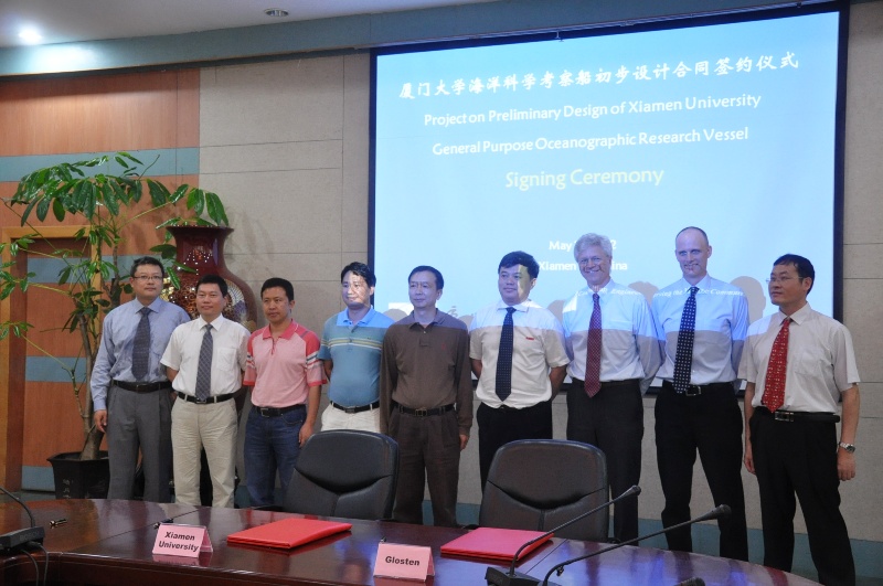 由国家“985”工程支持建设的厦门大学3000吨级海洋科学考察船初步设计招标工作已圆满结束。5月10日,由张颖副校长代表校方与中标方美国Glosten公司总裁Mr. Jay Edgar在颂恩楼正式签订科学考察船初步设计技术合同。此次海洋科学综合考察船项目初步设计技术合同的签署,标志着我校海洋科学考察船项目进入全面启动阶段。
