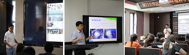 左:高坤山做题为“海洋光合作用和光生物学”的讲座 中:张文舟做题为“海洋对北太平洋西部台风的响应”的讲座 右:林柏岸做题为“吃海鲜,背后的小故事”的讲座