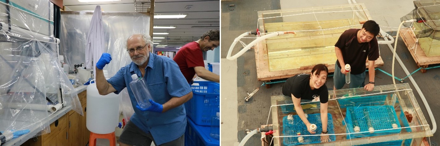 来自美国缅因大学的Mark Wells教授为生物生产力和培养研究小组取了一个形象的名字——大体积培养组(large volume incubation group),这是本航次“嘉庚”号上最多元化的一个研究团队,包括了我国自然资源部第二海洋研究所副研究员郝锵和朱元励、天津科技大学冯媛媛副教授、加拿大西安大略大学Charles Trick教授和上海交通大学张瑞峰副教授。据冯媛媛老师介绍,他们的工作主要是通过Fe和P添加试验,来探究西太平洋这一海洋荒漠区Fe和P对浮游植物固氮和固碳的限制作用。值得一提的是,张瑞峰副教授不仅参与“洁净”CTD海水采集和过滤,也是大体积培养小组的重要成员,他对气溶胶、上升流与海水TEIs之间的关系十分感兴趣。