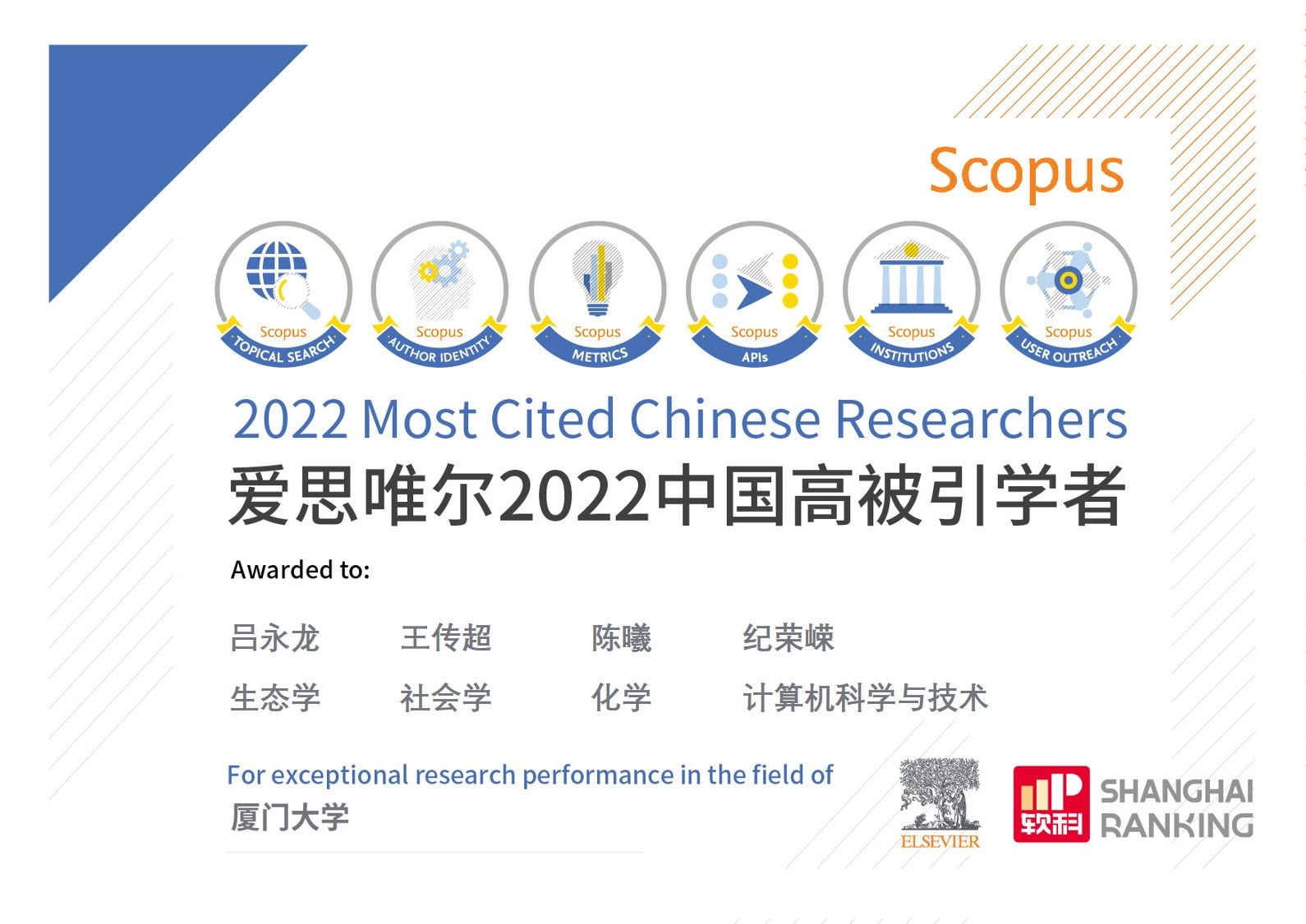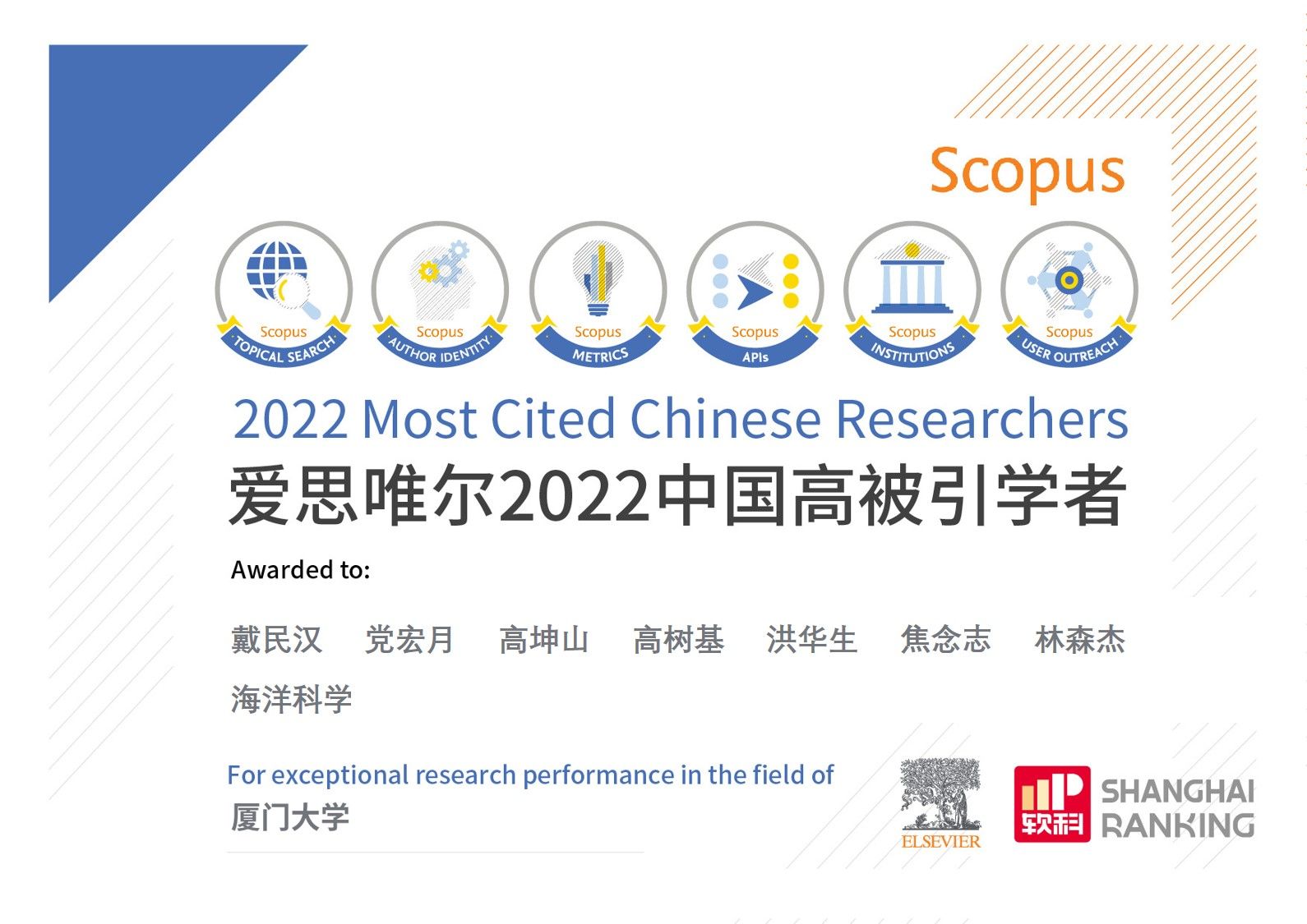 3月28日,全球性信息分析公司爱思唯尔(Elsevier)正式发布了2022年中国高被引学者(Highly Cited Chinese Researchers)榜单。厦门大学近海海洋环境科学国家重点实验室共有11位学者入选,其中戴民汉、党宏月、高坤山、高树基、洪华生、焦念志、林森杰7位教授入选海洋科学领域高被引学者,吕永龙教授入选生态学领域高被引学者,陈曦、纪荣嵘、王传超3位教授分别入选化学、计算机科学与技术、社会学领域高被引学者。