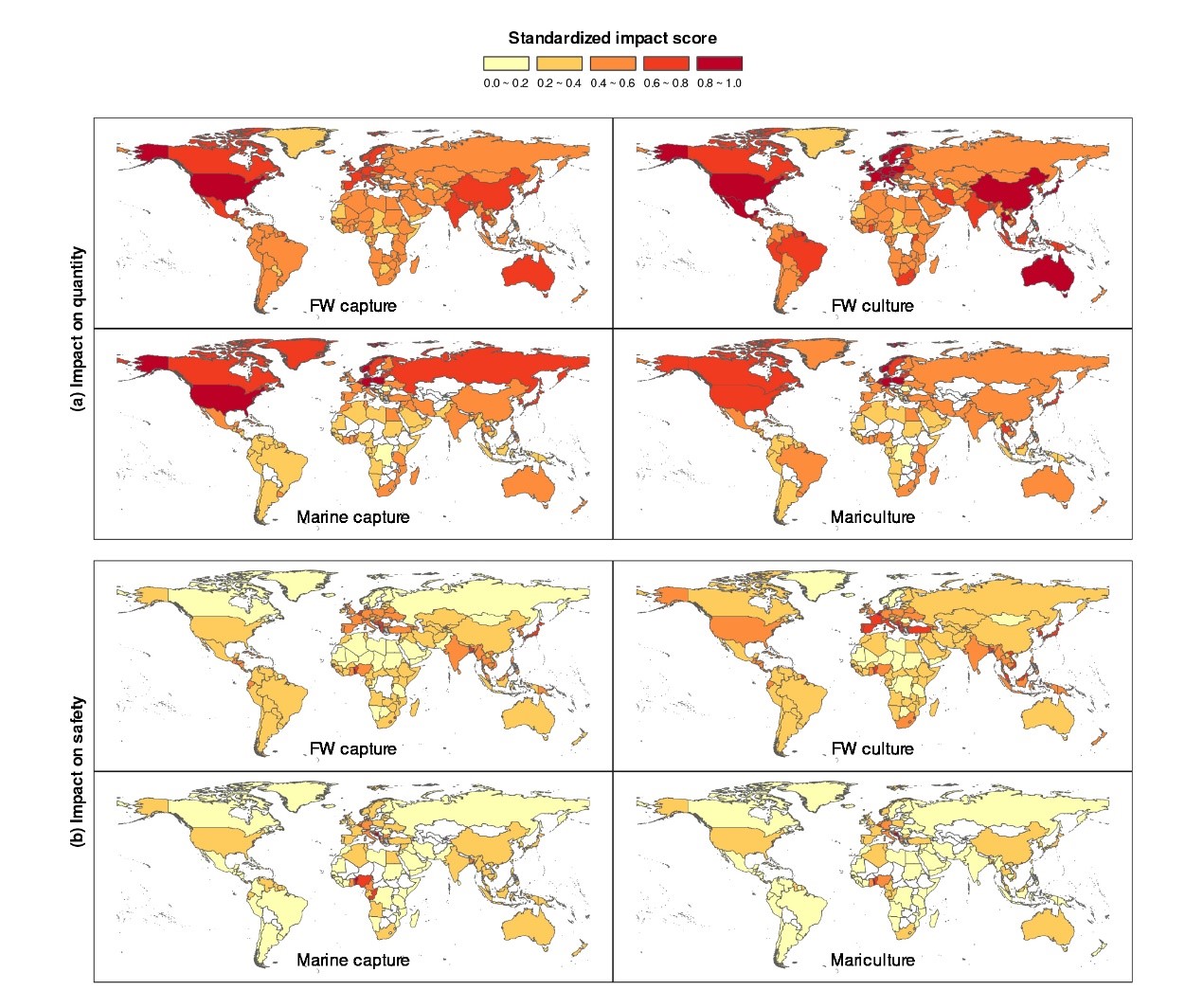 图2 环境压力对蓝色食物产量和安全性的影响指数全球分布