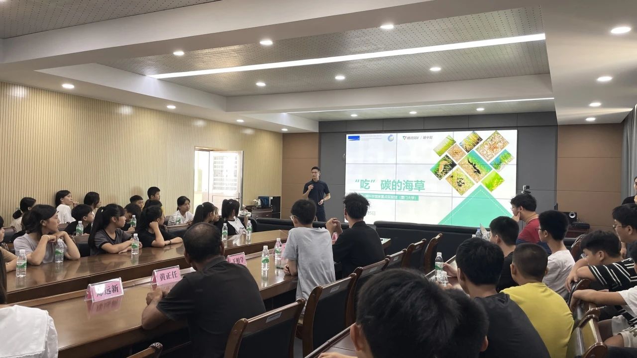沈渊副教授主讲海草床的碳汇知识,为学生们解答海草的定义以及海草的生态功能,让学生们对海草有了更进一步的了解。沈渊副教授还用生动形象的语言为学生们解释了碳汇这个重要概念。碳汇即从大气中吸收二氧化碳等温室气体的过程,而相较于陆地生态系统参与碳循环形成的“绿碳”“蓝碳”是指利用海洋生物吸收大气中的二氧化碳,并将其固定在海洋中的过程、活动和机制。海草床作为典型的蓝碳系统之一,有着巨大的碳汇潜力,它的固碳效率高、碳储量大、储碳周期长,在科学界得到越来越多的关注。