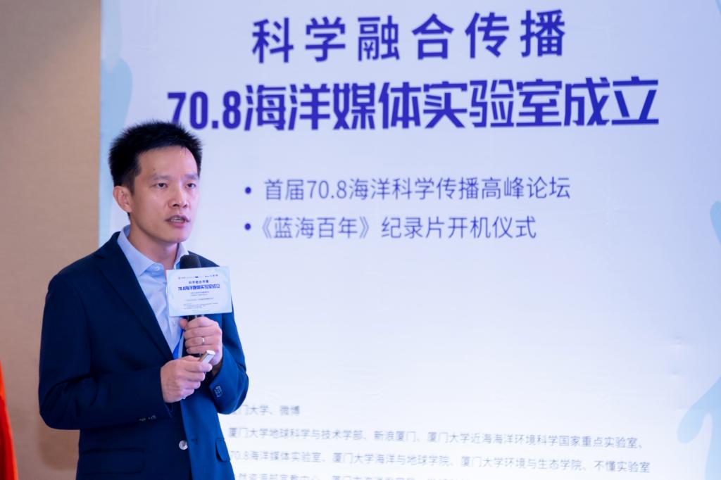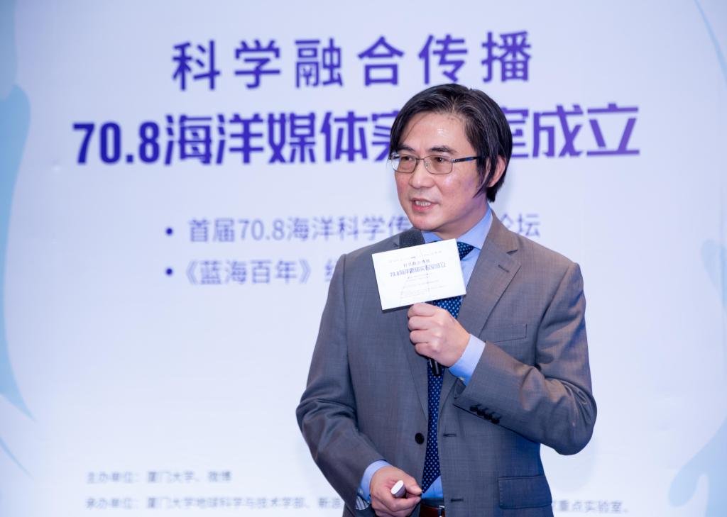 在成立仪式上,70.8海洋媒体实验室主任、厦门大学近海海洋环境科学国家重点实验室首席科学家、环境与生态学院副院长史大林教授介绍了实验室设立的基础和实验室整体构想。他提到,厦门大学因海而生伴海而长,是中国海洋科学的摇篮之一。2011年,厦门大学组建地球科学与技术学部(以下简称地学部),厦门大学海洋学科以及以海洋为特色的环境学科、生态学科已跻身国内一流、国际领先。厦门大学海洋学科在取得令人瞩目的成绩的同时,意识到搭建海洋科研与公众教育之间的桥梁、海洋科学与文化传播的渠道等亟待提升。长期以来,厦门大学地学部在扎实推进海洋科学研究的同时,不遗余力地致力于海洋科学传播与教育,并积极探索新的途径、新的形式,以提升全民的科学素养与海洋意识,让更多人关注海洋、了解海洋、热爱海洋。据统计,自2012年起每年一度的厦门大学海洋开放日活动,迄今已吸引了共计约2.8万名公众的参与。2018年4月,厦门大学地学部与新浪厦门联合推出“跟着嘉庚号科考去”随船科考体验和“嘉庚号的法国朋友”来厦直播,掀起公众对厦门大学“嘉庚”号、海洋科考及海洋文化的关注热潮,形成了良好的互信和合作基础。2018年7月,厦门大学地学部与新浪厦门签订了战略合作协议,随后双方交流互动不断深入,合作层级和方式不断提升。为进一步推进纵深合作,双方联手创建“70.8海洋媒体实验室”。