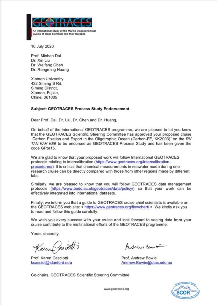 GEOTRACES科学指导委员会主席发给本项目及航次首席的认证信