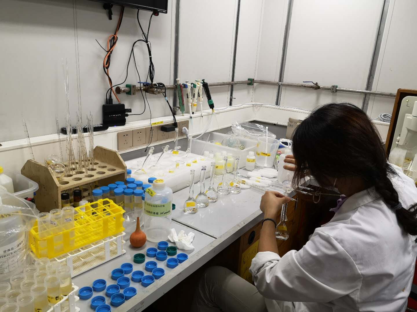 左:王丽芳工程师正在配制常规营养盐标准;右:柳欣副教授在主实验室进行浮游生物显微镜鉴定