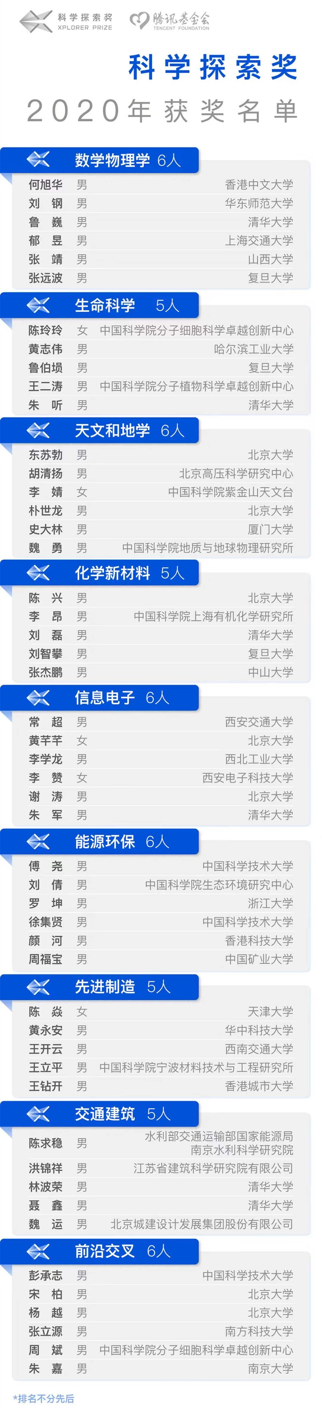 “科学探索奖”由饶毅、施一公、潘建伟等14位知名科学家和腾讯公司董事会主席马化腾于2018年11月联合发起,聚焦数学物理学、生命科学、天文和地学、化学新材料、信息电子、能源环保、先进制造、交通建筑、前沿交叉等9个领域,支持在中国内地及港澳地区全职工作、45周岁及以下的青年科技工作者,每年评选产生50位获奖人。