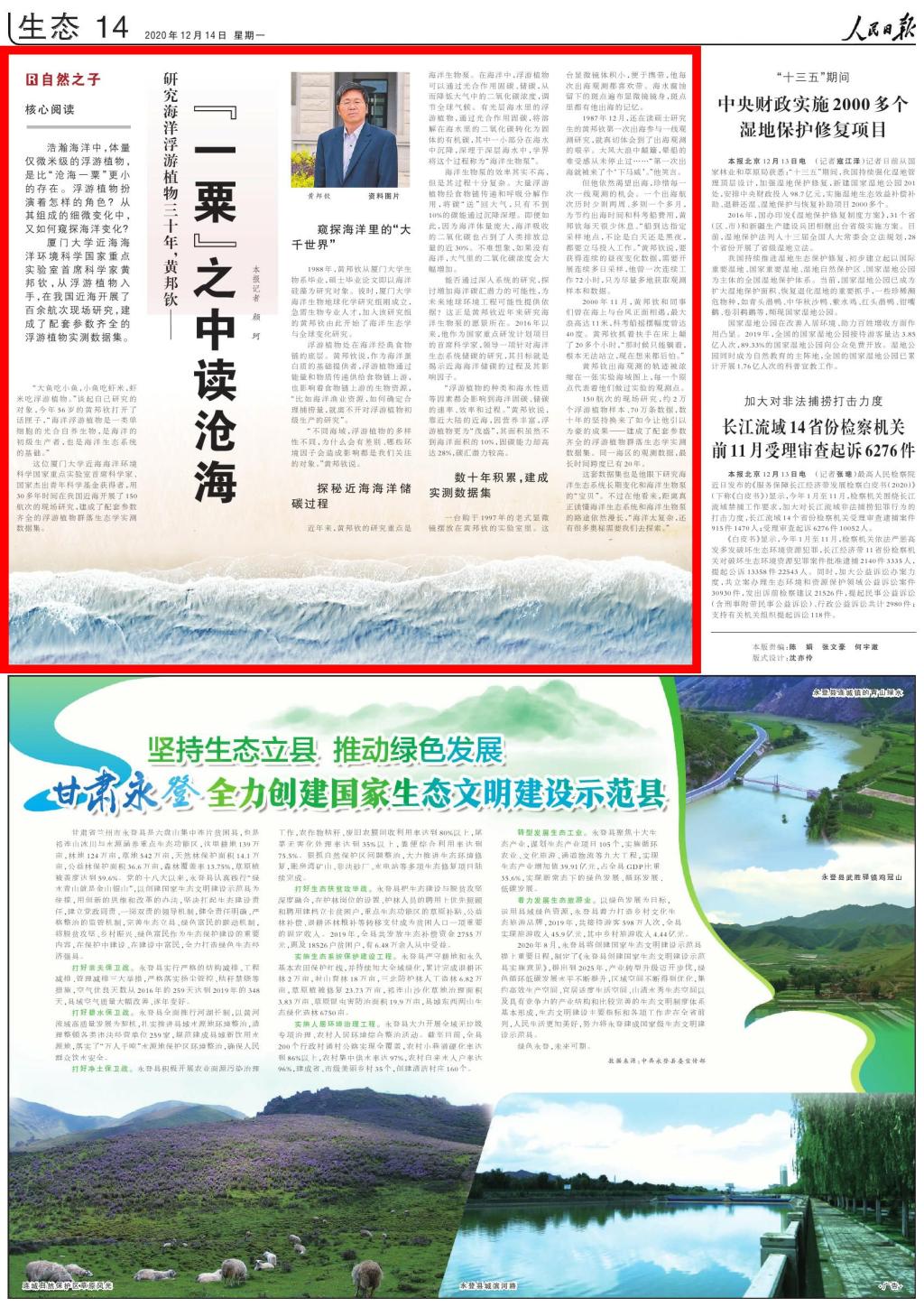 《人民日报》12月14日第十四版刊发题为《研究海洋浮游植物三十年,黄邦钦——“一粟”之中读沧海(自然之子)》的深度通讯,讲述我校环境与生态学院黄邦钦教授探秘近海海洋储碳过程,建成实测数据集的科研故事。