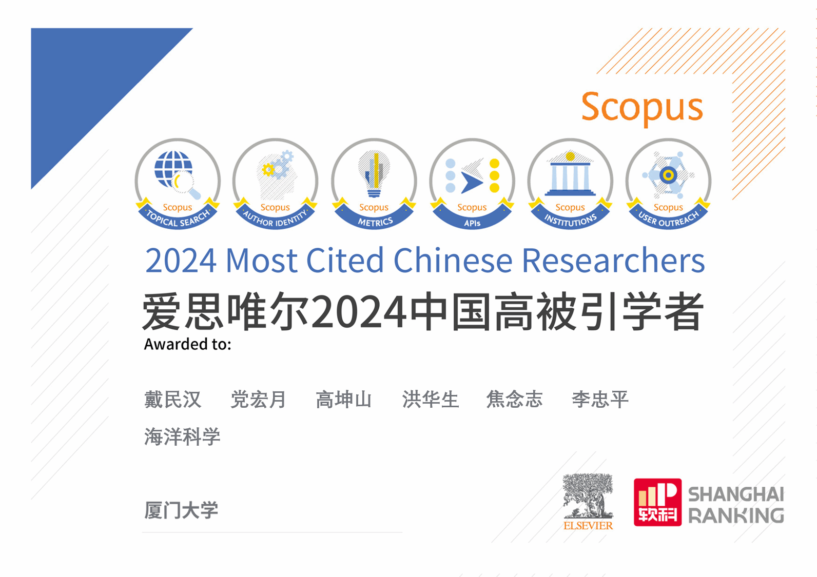 3月25日,爱思唯尔(Elsevier)正式发布了2024年中国高被引学者(Highly Cited Chinese Researchers)榜单。厦门大学海洋生物地球化学全国重点实验室共有11位学者入选,其中戴民汉、党宏月、高坤山、洪华生、焦念志、李忠平6位教授入选海洋科学领域高被引学者,陈曦、纪荣嵘、刘向阳、吕永龙、王传超5位教授分别入选化学、计算机科学与技术、物理学、生态学、社会学领域高被引学者。