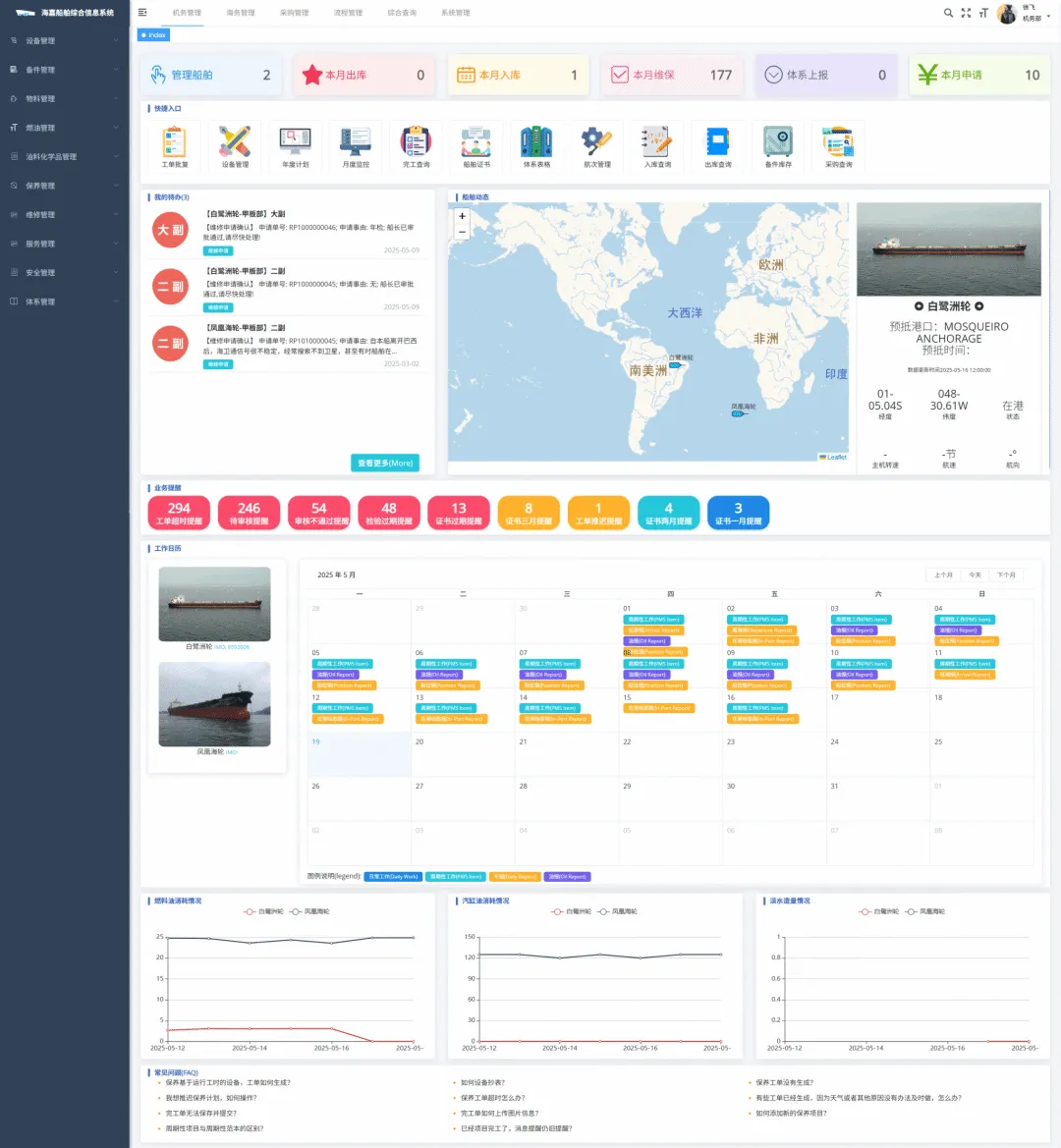 该系统通过数字化手段,将这些原本分散、低效的管理工作整合起来,就像给船舶配备了一个“智能管家”,实现了船舶安全管理体系、人员、设备、安全、采购、资产的全要素动态管控。无论是在船舶日常运营,还是安全体系运行与应急响应中,该系统都能提供统一、高效的支撑,在同类产品中独树一帜。