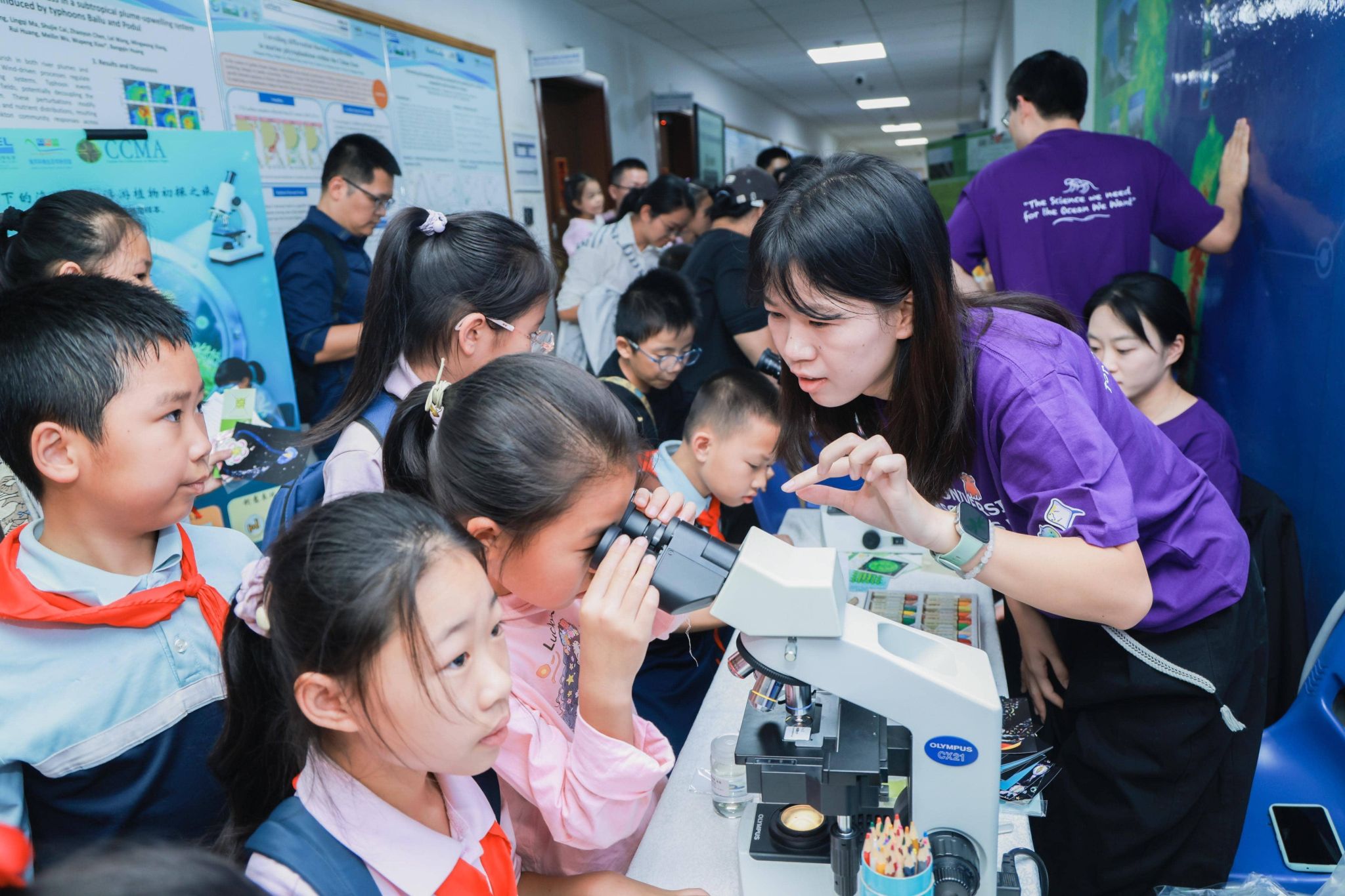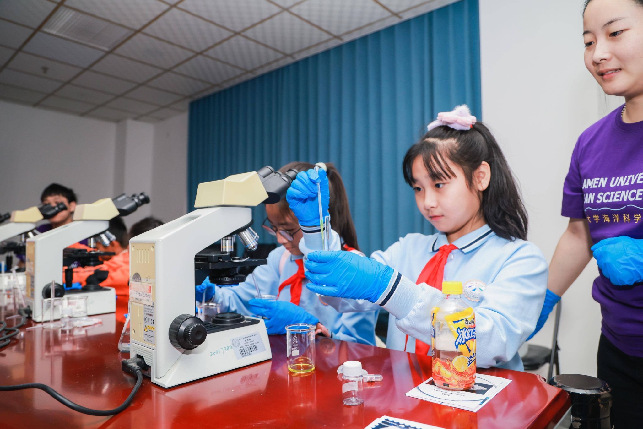 实验课堂是本届开放日最具人气的亮点。活动设置“微光世界探秘者——从化学到生命的发光奇迹”“盐度闯关记,鲍鱼的生存大冒险”“污水处理小侦探:探秘工艺&亲手制作简易净水器”“小小‘藻’油工厂——微拟球藻产物的提取” 等 17个主题近90场实验,通过“科研人讲解 + 参与者操作”结合的模式,让公众尤其是青少年在专业指导下了解实验背景,沉浸式体验“成为科学家”。其中,在“微光世界探秘者——从化学到生命的发光奇迹”的实验课堂现场,鲁米诺化学发光实验产生的漂亮荧光蓝让现场的孩子和家长们都发出阵阵惊叹:“哇,太美了!”;家长们纷纷表示,这种在实践中学习的科普形式极大激发孩子兴趣,在趣味的实验中理解了海洋科学的原理,留下深刻印象。