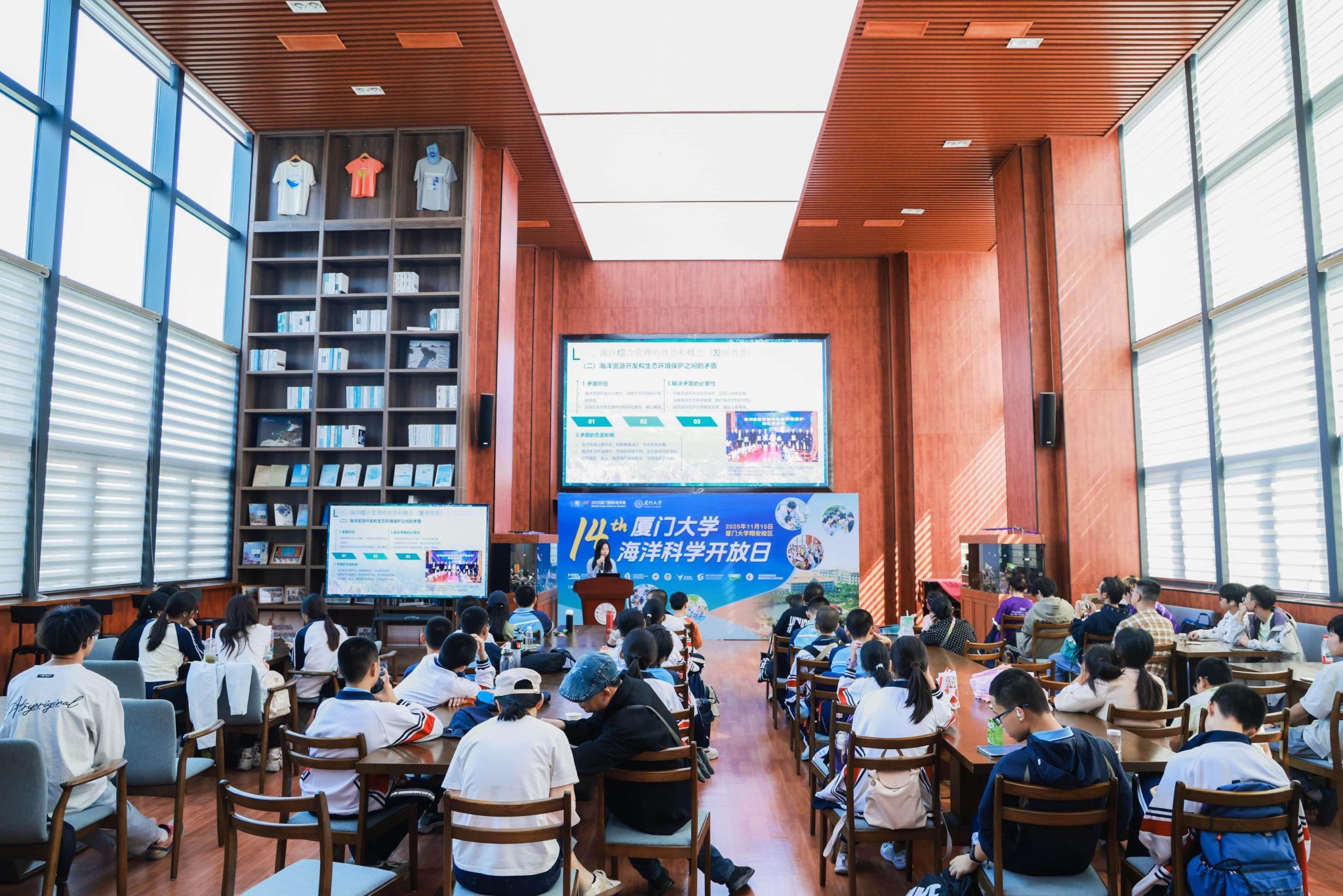 本次开放日重点推出“海洋文化十八讲”系列讲座。《海洋文化十八讲》是厦门大学戴民汉院士主编的高校海洋通识教材,面向高校学生及社会公众普及海洋知识,意在提升全民海洋意识,服务于我国海洋强国的战略布局。讲座邀请到厦门大学副教授王智等核心科研团队成员主讲,带来《海洋物质循环的幕后推手--底栖生物大揭秘》《声声不息的海洋》《海洋管理的科学演进与实践探索--从全球挑战到中国方案》《走向深蓝:我们的海洋、财富与未来》等主题分享,带领观众进一步了解海洋科学与人文的故事。此外,“青少年海洋分享家”“探秘滨海湿地”系列讲座也分享了更多新生代力量与海洋科学的故事,展示了滨海湿地的生态智慧与魅力。