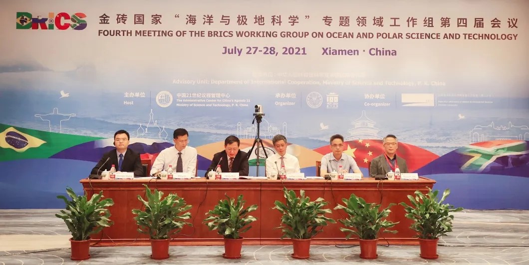 金砖国家(BRICS)“海洋与极地科学”专题领域工作组第四届会议于2021年7月27-28日通过视频方式召开。本次会议由中国担任主席国,来自中国、巴西、俄罗斯、印度、南非等金砖国家的近100位政府官员和科学家代表参会。在科技部国际合作司的指导和厦门市金砖创新基地建设领导小组办公室(下称“厦门市金砖办”)的支持下,会议由中国21世纪议程管理中心(简称“21世纪中心”)主办、厦门大学承办、近海海洋环境科学国家重点实验室协办。科技部国际合作司陈霖豪副司长、21世纪中心孙洪总工程师、厦门大学周大旺副校长、厦门市金砖办李铭副主任等领导莅临会议并致辞。