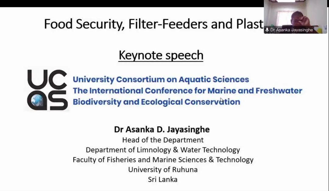 当天下午,来自斯里兰卡卢哈纳大学的Asanka Jayasinghe博士给大家带来了题为“Food Security, Filter-Feeders and Plastics“的主题报告。Asanka博士在报告中介绍了微塑料污染对滤食性养殖鱼类可能造成的毒理、生理损伤,以及因此而对全球养殖业、粮食安全造成的潜在威胁。