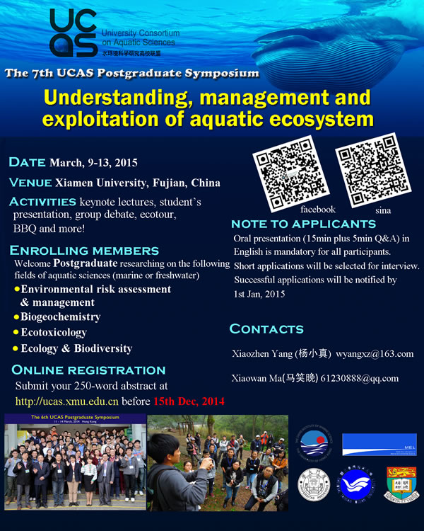 为进一步巩固合作,扩大交流,UCAS发起了第七届UCAS高校水环境科学研讨会,并诚邀海峡两岸暨香港、澳门更多的研究生参与其中。本次研讨会将于2015年3月9-13日回到厦门大学举办,以“Understanding,management and exploitation of aquatic ecosystem(理解,管理和利用水生生态环境)”为主题,涉及生态与生物多样性、生态毒理学、生物地球化学、渔业与水产养殖、环境风险评估与管理等领域,采取个人报告、嘉宾演讲、小组辩论等多种形式,同时还将组织野外考察等活动,使与会者在自由开放的学术氛围中,达到交流学习的目的。