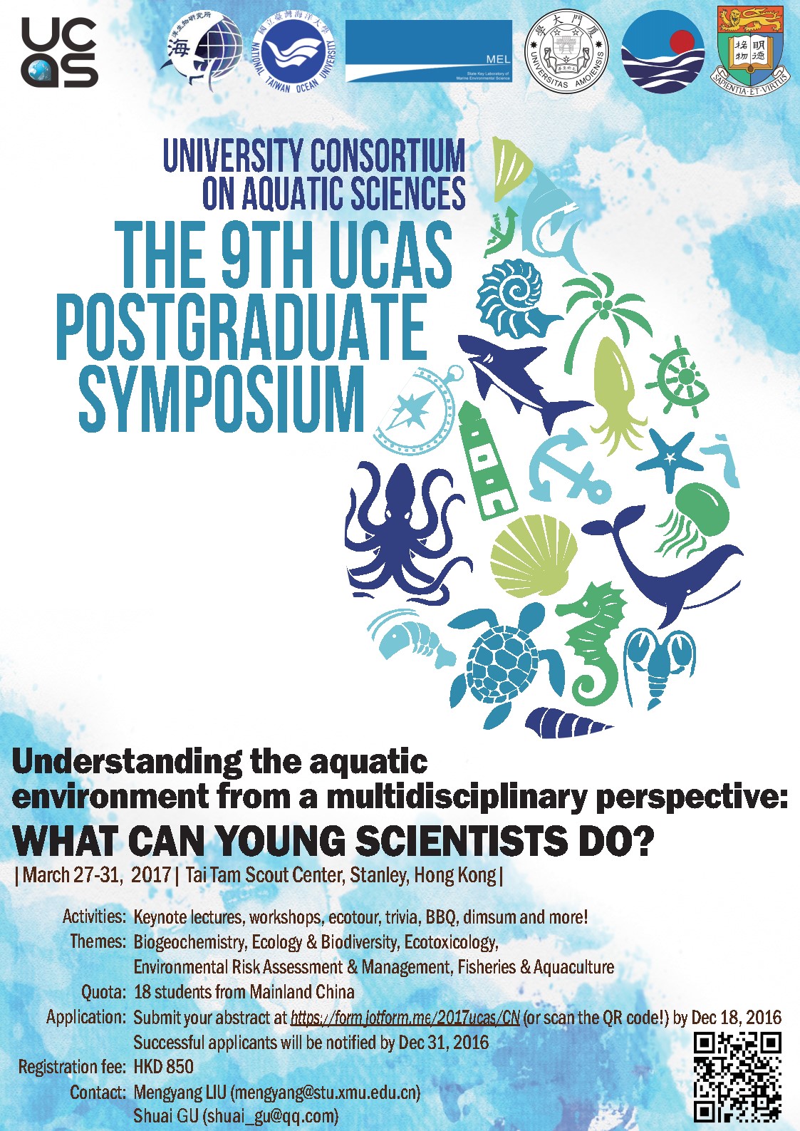 本次研讨会将于2017年3月27-31日在香港举办,以“Understanding the aquatic environment from a multidisciplinary perspective: what can young scientists do?”为主题,涉及生态与生物多样性、生态毒理学、生物地球化学、渔业与水产养殖、环境风险评估与管理等领域,采取个人报告、嘉宾演讲、小组抢答等多种形式,同时还将组织野外考察等活动,使与会者在自由开放的学术氛围中,达到交流学习的目的。历届活动详情请见http://ucas.xmu.edu.cn。