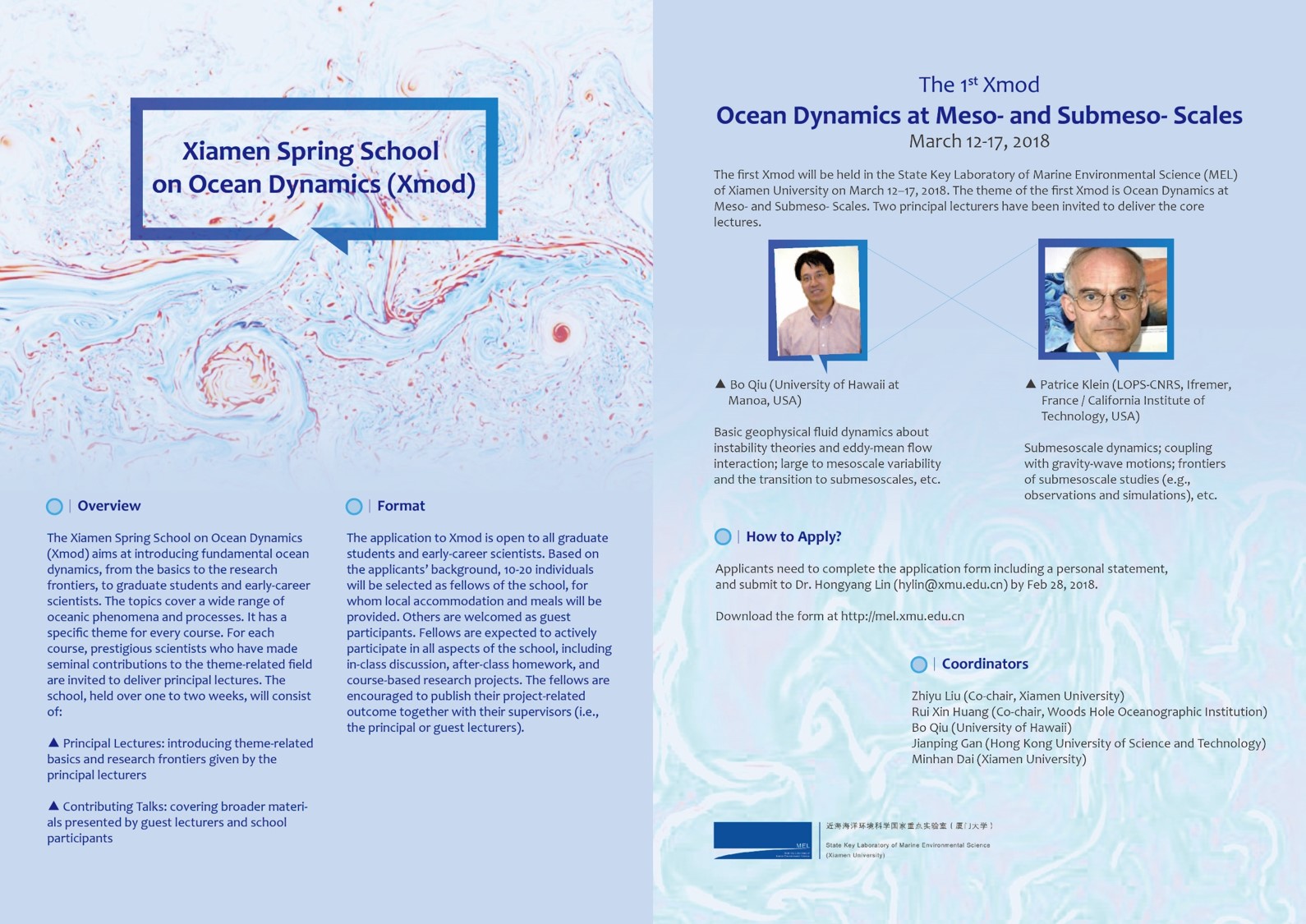 The first Xmod will be held in the State Key Laboratory of Marine Environmental Science (MEL) of Xiamen University on March 12–17, 2018. The theme of the first Xmod is Ocean Dynamics at Meso- and Submeso- Scales. Two principal lecturers have been invited to deliver the core lectures, including
