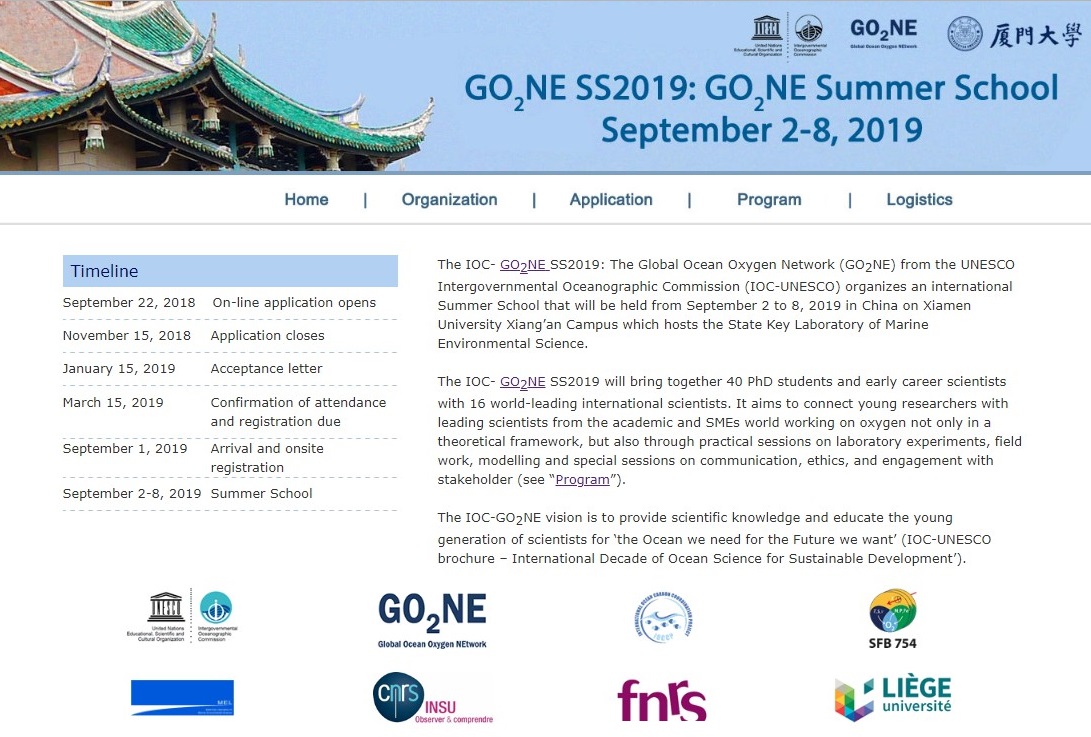 The IOC- GO2NE SS2019: The Global Ocean Oxygen Network (GO2NE) from the UNESCO Intergovernmental Oceanographic Commission (IOC-UNESCO) organizes an international Summer School that will be held from September 2 to 8, 2019 in China on Xiamen University Xiang’an Campus which hosts the State Key Laboratory of Marine Environmental Science.